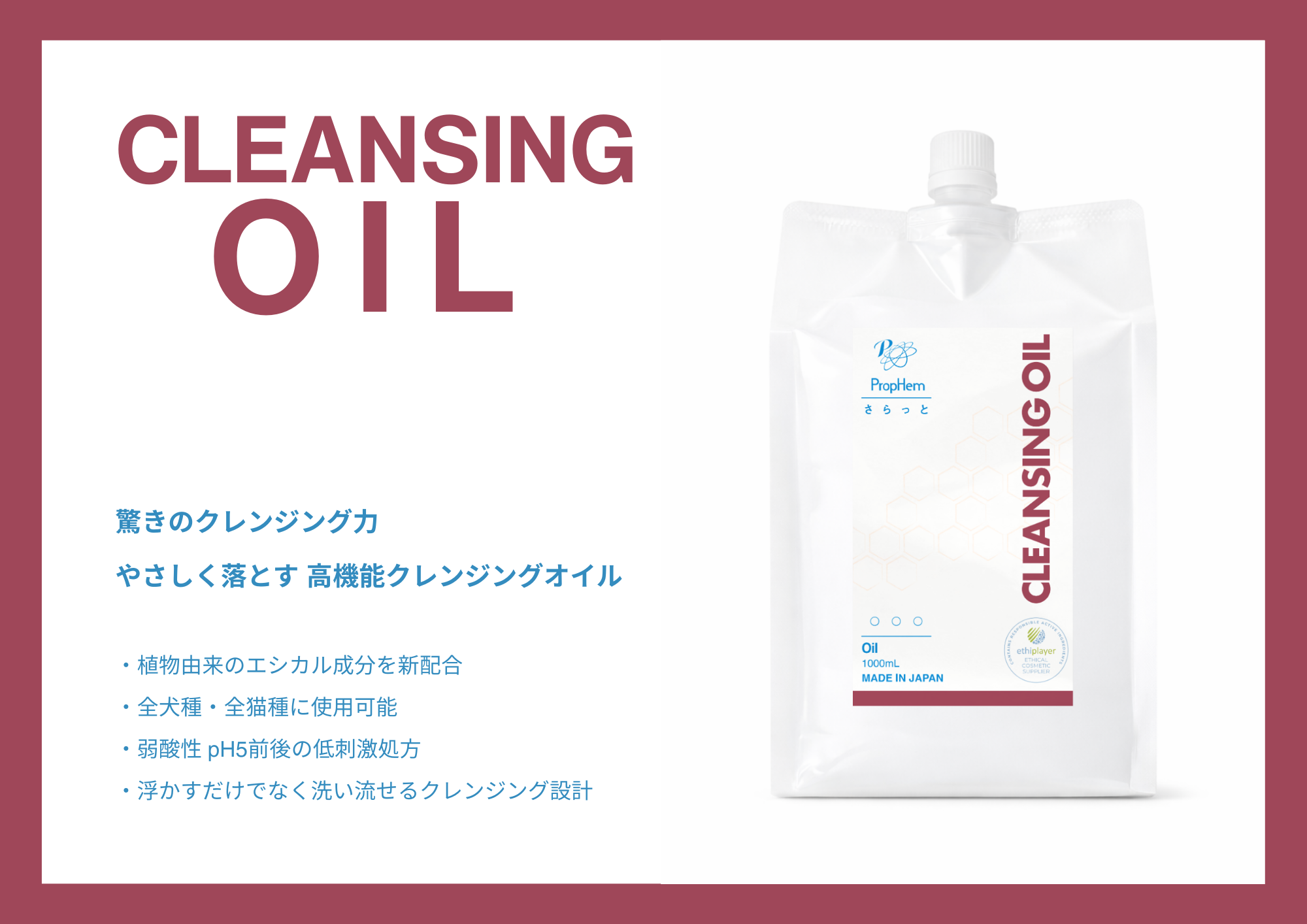 ●クレンジング機能を有する植物由来のオイルを活用して作られた、皮膚や被毛に優しいクレンジングオイル。